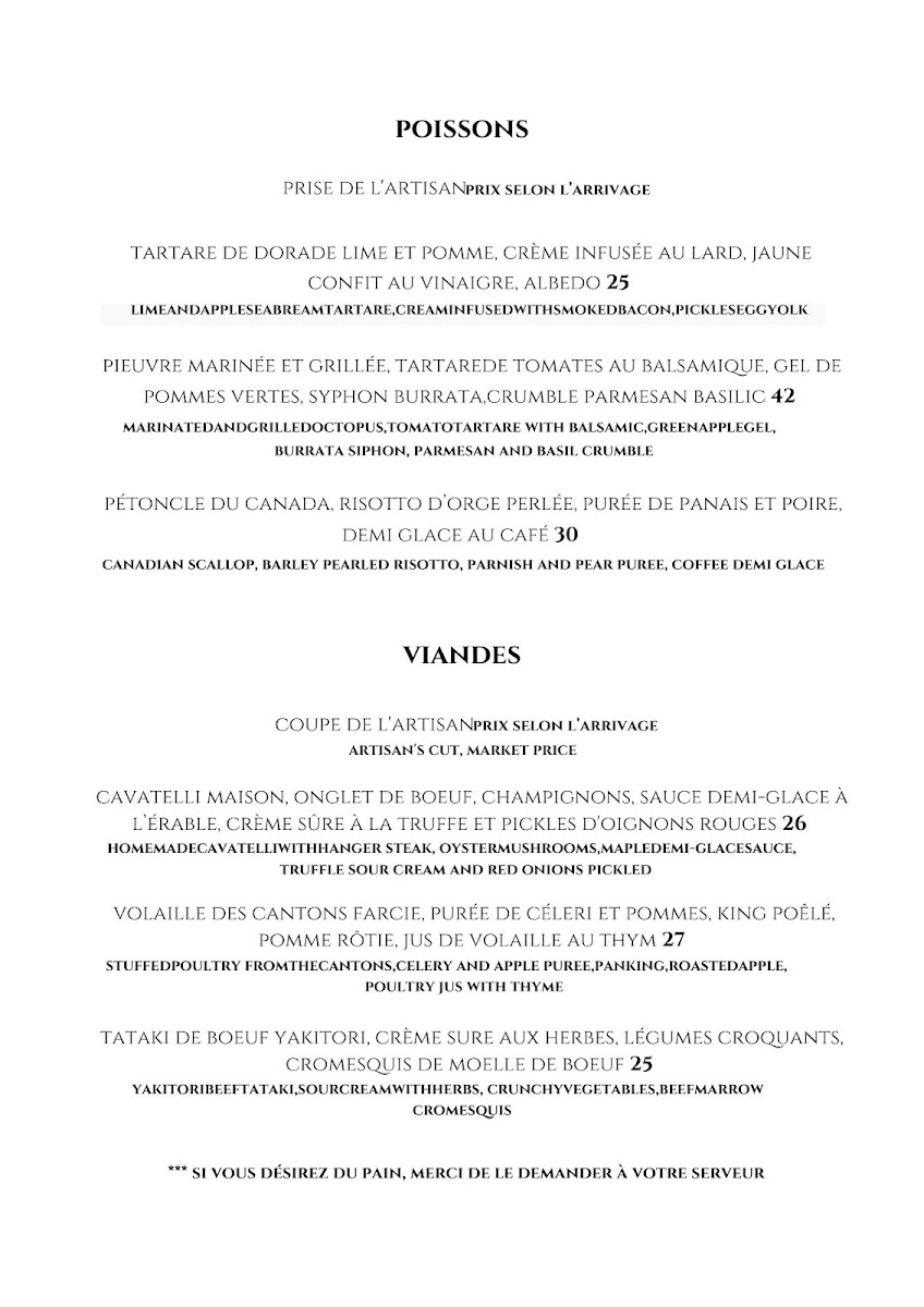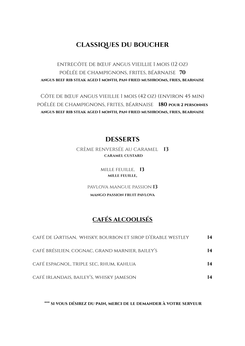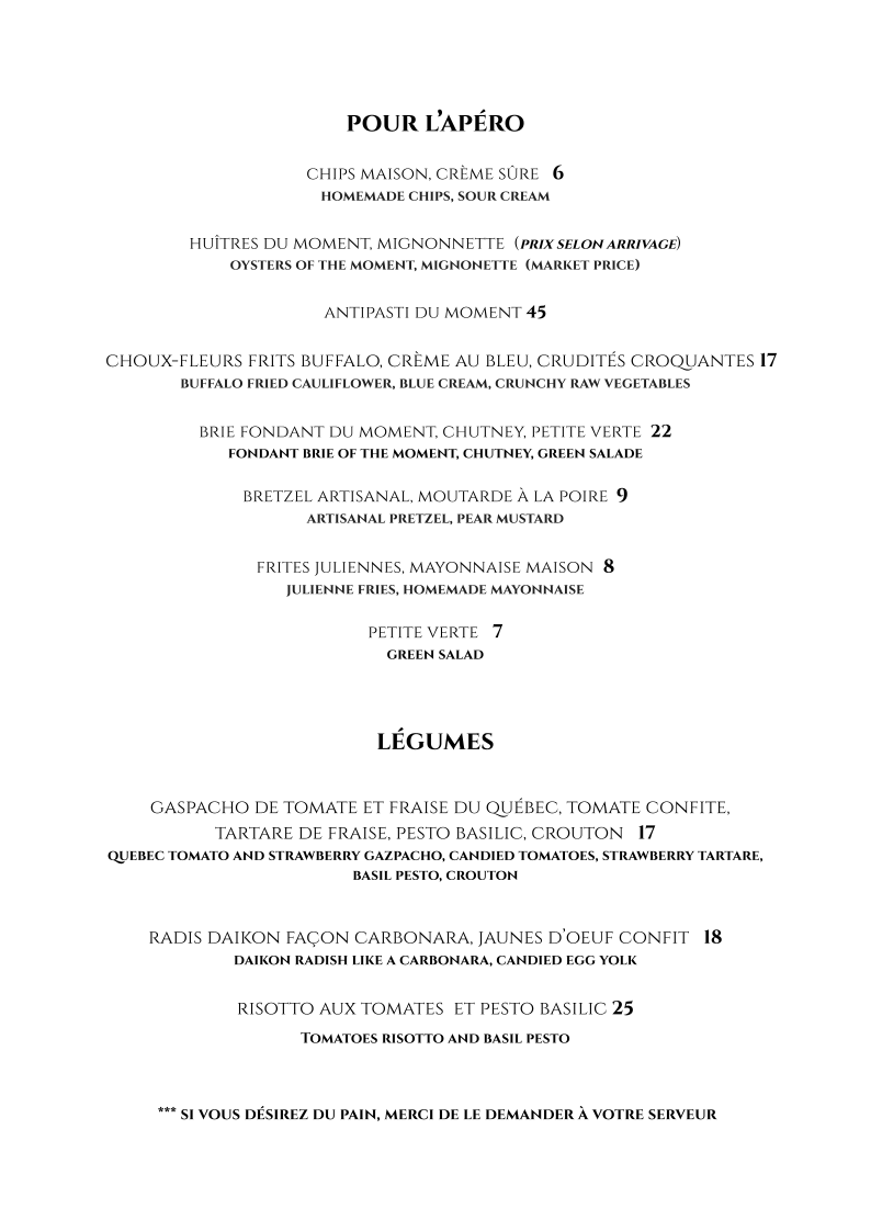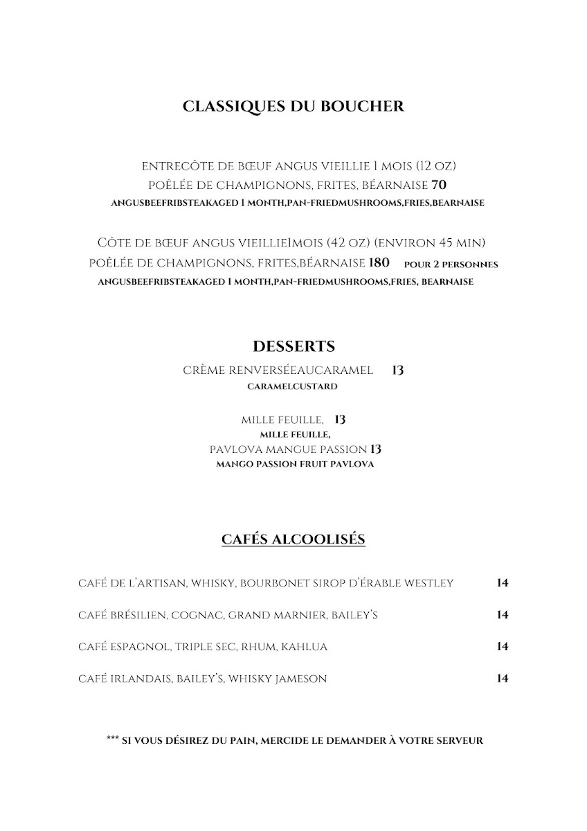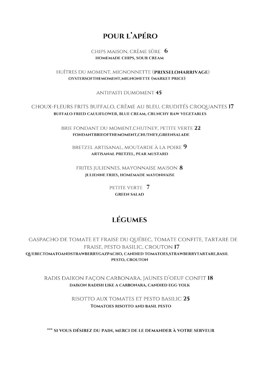 Guests often indulge in small shared plates like the marinated and grilled pieuvre or a selection of fresh oysters as an appetizer, setting the tone for a meal that invites conversation and savoring. The main course options provide comforting yet sophisticated choices, such as rich cavatelli au canard or a perfectly cooked côte de bœuf Angus, reflecting the kitchen’s attention to detail and seasonality.